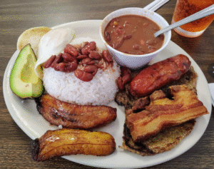 El icónico plato colombiano con frijoles, arroz, chicharrón, aguacate, huevo y más.